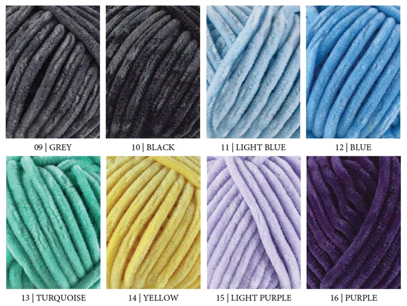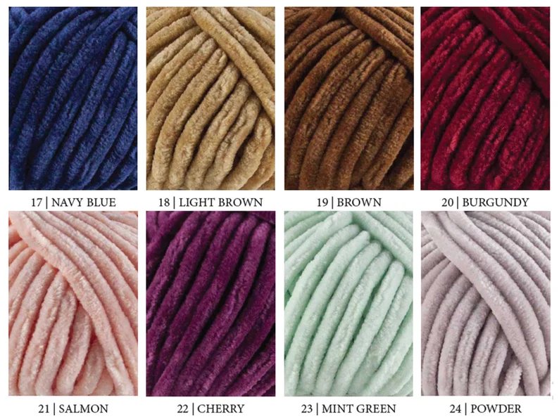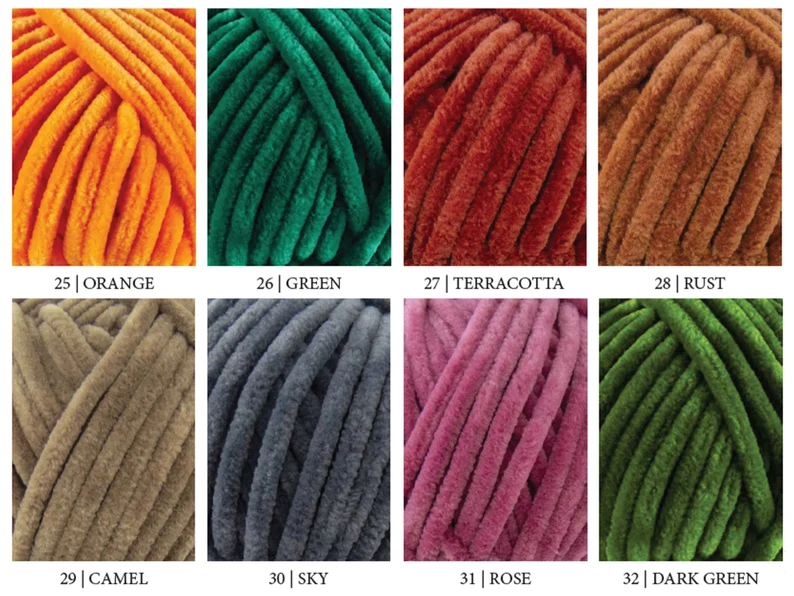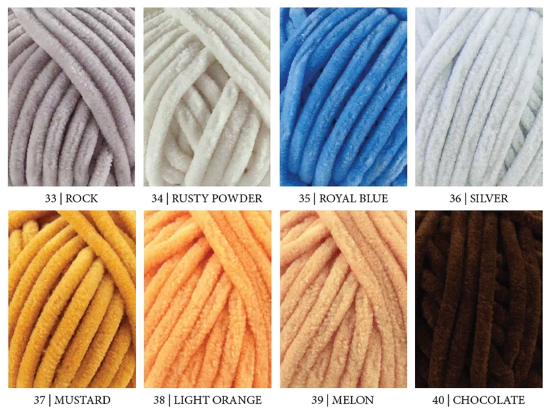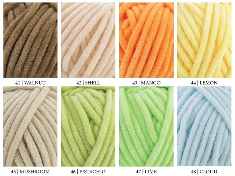 01 – white, 04 – light pink, 06 – dark pink, 08 – red, 09 – gray, 10 – black, 12 – blue, 14 – yellow, 19 – brown, 23 – mint green, 24 – powder, 25 – orange, 26 – green, 28 – rust, 32 – dark green, 39 – melon, 41 – walnut, 42 – shell, 44 – lemon, 45 – mushroom, 47 – lime, 50 – blueberry, 55 – viola, 65 – tangerine